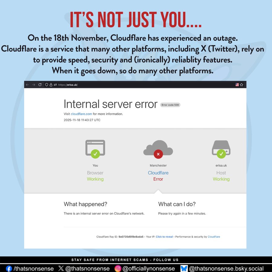 Today’s Cloudflare outage exposed the fragility of modern internet systems. Many online services rely on centralized infrastructure. When Cloudflare went down, millions of websites and APIs failed instantly. One user wrote, “If events like this don’t show you that everything can be switched off, nothing will.”