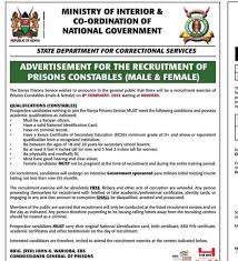 The Kenya Prisons Service (KPS) has officially announced a mass recruitment exercise for 2025, targeting constables, professional cadet officers, technicians, and artisans.